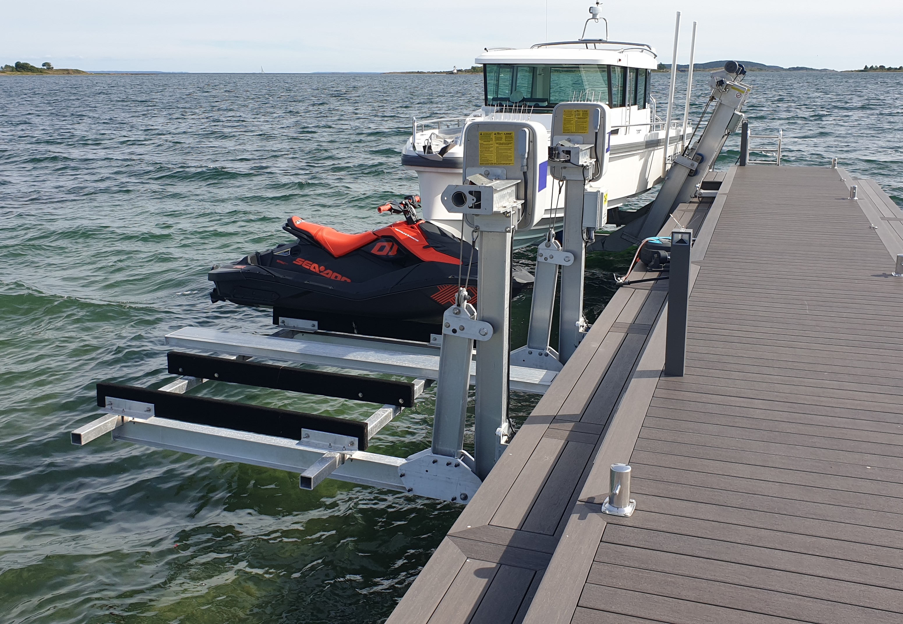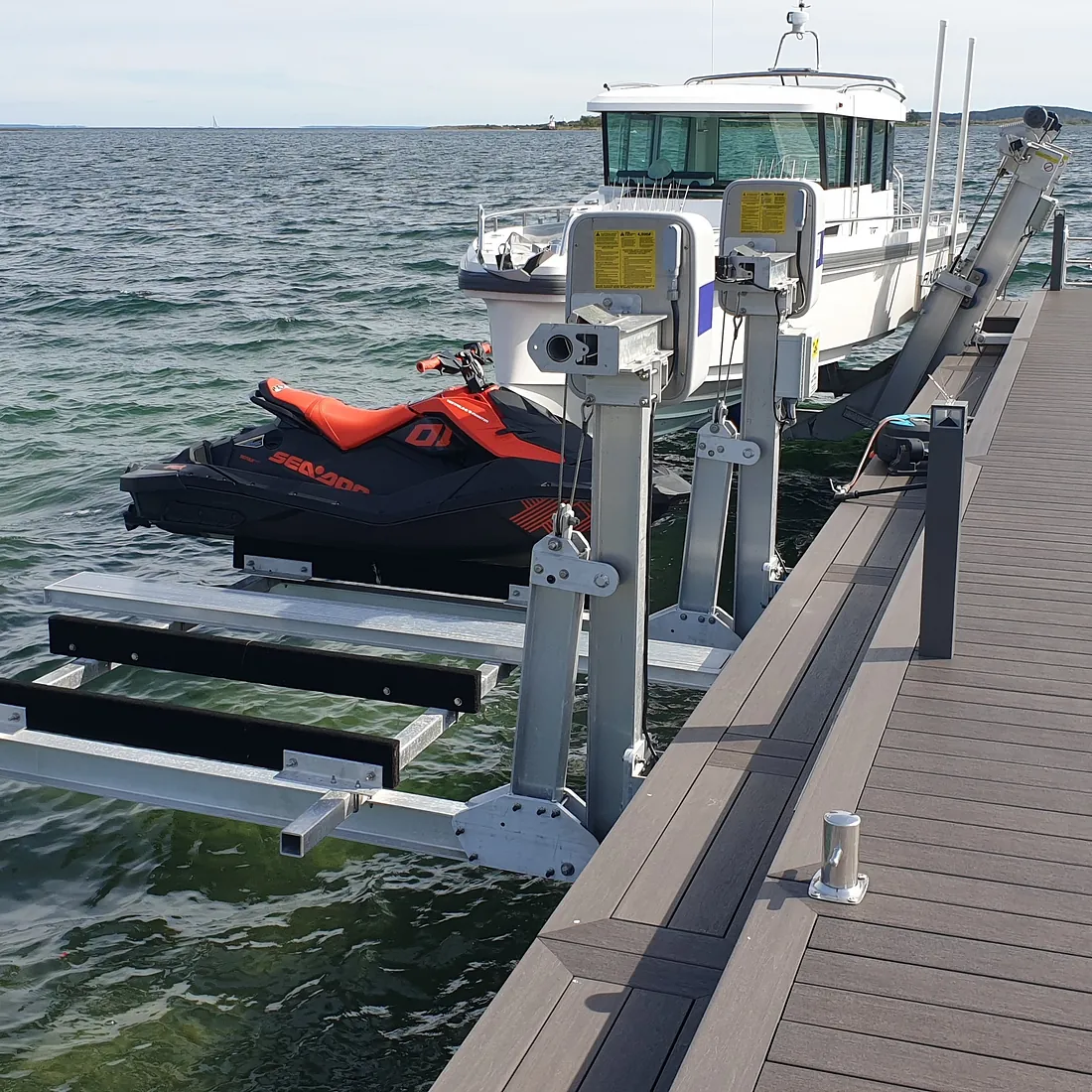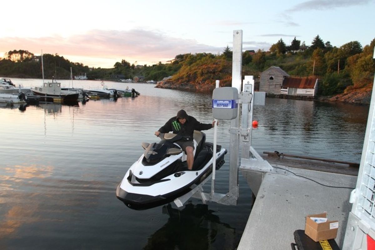 Vannscooterliften leveres med brakett for pæle montering eller med brakett for montering på brygge. Vannscooterliften kan leveres med høyre eller venstre sving. Den minste vannscooterliften løfter 680 kg. Det at vannscooteren enkelt kan svinges inn på brygga gjør service og vedlikehold meget enkelt.